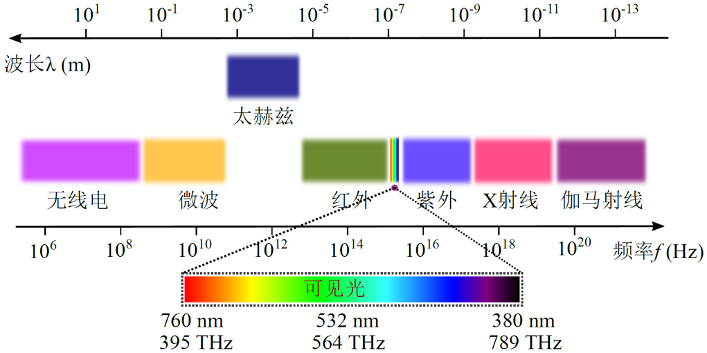 Figure: Electromagnetic spectrum, from radio waves to γ-rays. THz wave covers the region (0.1-10 THz) of the spectrum between microwave and infrared.