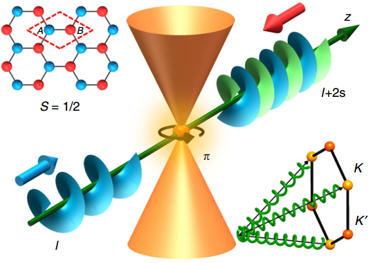 在学期间,同时研究利用破缺的蜂巢型光子晶格体系在光学体系模拟了自由电子的一种传统的量子行为——Zitterbewegung效应,发现当同时激发破缺的蜂巢型光子晶格体系的两个赝自旋态时,发现原本没有轨道角动量的高斯入射光在晶格的传播过程中,光束呈螺旋状向前传播,其质心轨迹也呈螺旋状,因此出射光束具有了轨道角动量。理论上计算解释了此螺旋效应是由于位于同一赝自旋态的两个拓扑荷的干涉而产生。
