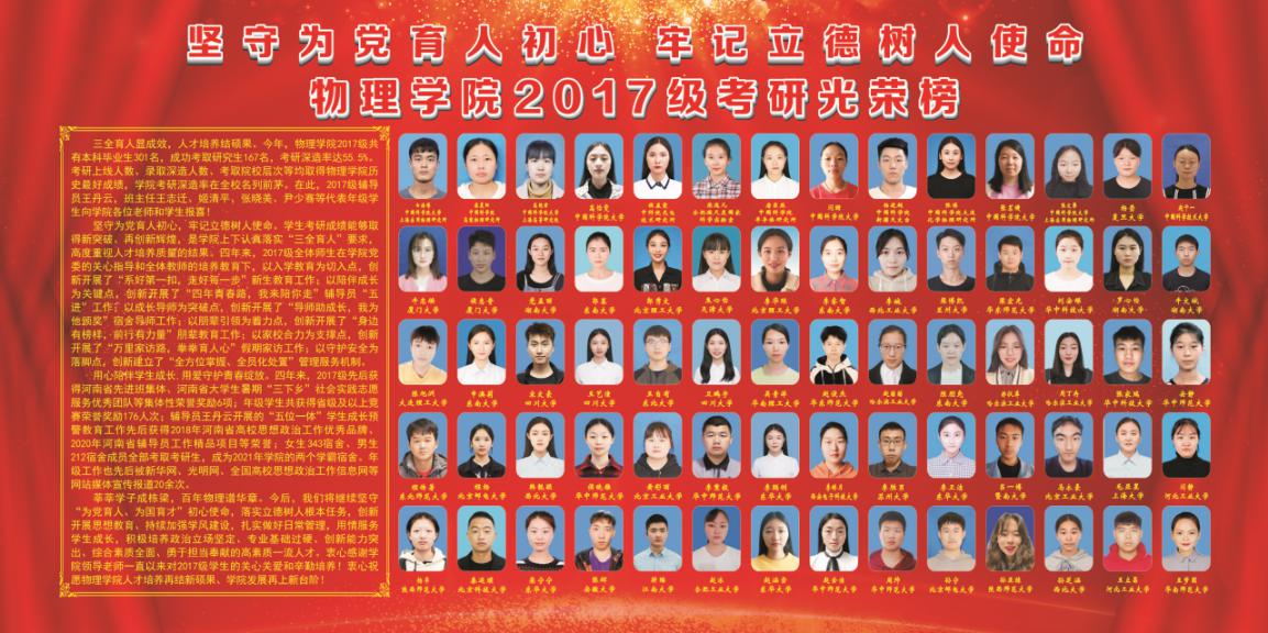 三全育人显成效,人才培养结硕果。今年,物理学院2017级共有本科毕业生301名,成功考取研究生167名,考研深造率达55.5%。考研上线人数、录取深造人数、考取院校层次等取得物理学院历史最好成绩,学院考研深造率在全校名列前茅。其中,女生343宿舍、男生212宿舍成员全部考取考研生,成为学院今年的两个学霸宿舍。在此,2017级辅导员王丹云,班主任王志迁、姬清平、张晓美、尹少骞等代表年级学生向学院各位老师和学生报喜!