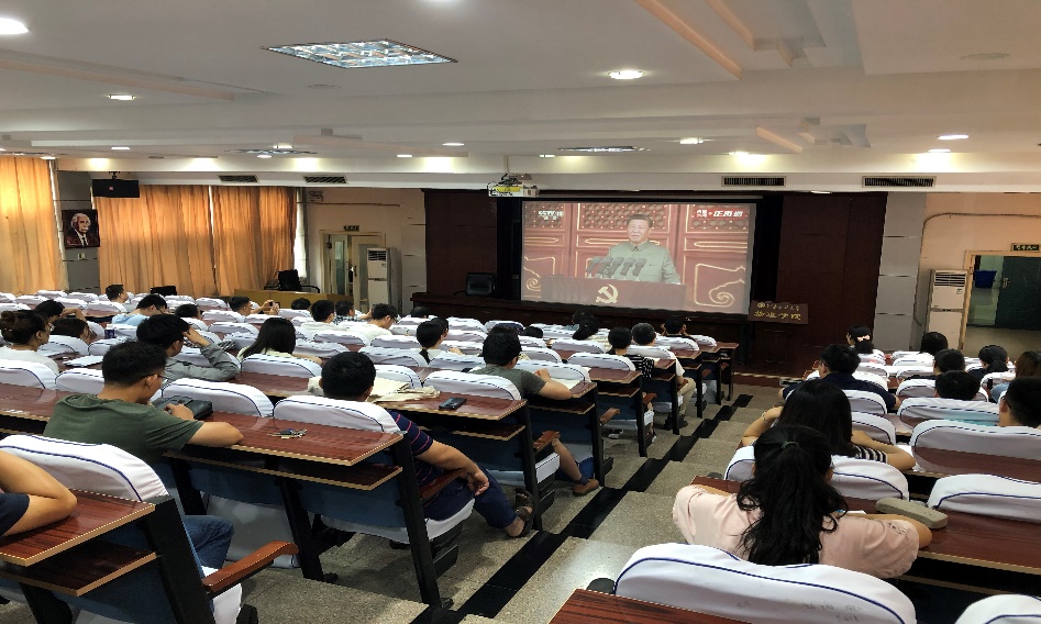 庆祝中国共产党成立100周年大会上午8时在北京天安门广场隆重举行。中共中央总书记、国家主席、中央军委主席习近平将发表重要讲话。物理学院组织全体师生党员百余人在物理南楼二楼报告厅、党建活动室等集中观看了活动直播。
