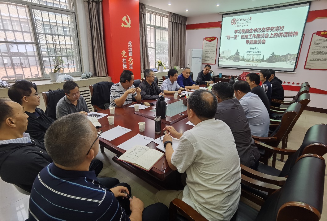 刘玉芳首先就省委、省教育厅对于“双一流”创建、学科发展、省级实验平台建设等方面的要求和形势进行了介绍,并就学院发展、学科发展的情况进行了具体的分析和研判。一是要提高站位,主动担当,全面投入发展创建工作;二是要重视发展,研判形势,把握学科发展重点方向;三是要打造特色,深挖潜力,服务河南社会经济建设发展;四是要优化团队,整合平台,聚焦学科建设人才梯队培养。