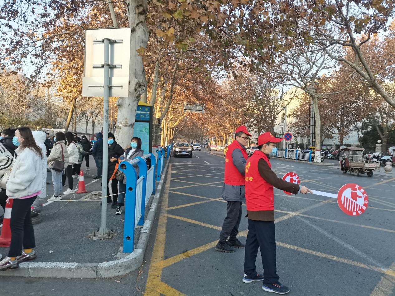 12月4日正值2022年普通高校招生艺术类专业省统考,早上七点左右,附中考点门口聚集了很多考生和家长,学校门口人流量很大。党员志愿者们佩戴小红帽、身穿红马甲、手执文明礼让指示牌站在学校以及附中门口,认真地维持着交通秩序,提醒过往行人注意交通信号灯,对不走斑马线、闯红灯、乱穿马路的行人进行劝导,对随意调头、越线停车的车辆进行劝阻,并向群众详细讲解交通违法行为的危害性,积极引导广大群众遵守交通规则。