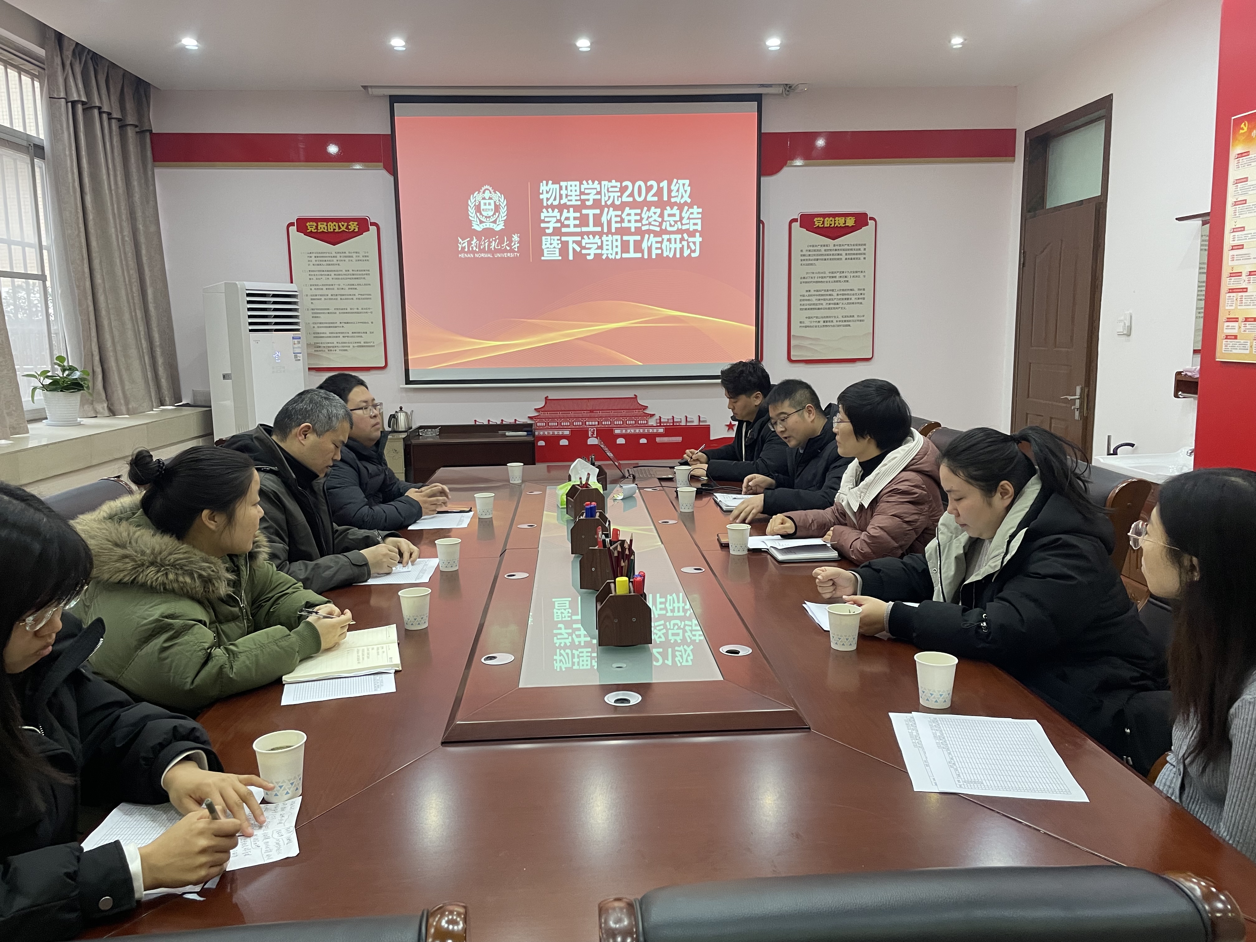 赵旭副书记对本学期2021级学生工作的开展及辅导员和班主任老师的工作给予了高度评价,希望班主任老师能够发挥自身专业优势,培养树立学生的专业认同与专业自信,帮助学生端正学习目的、制定学习计划、改进学习方法、提高学习效率,在学生参加课外科技活动及各类竞赛活动等方面传经送宝,助力其成长成才;希望辅导员和班主任老师假期利用线上班会等方式对学生开展疫情防控教育、爱国爱校教育、防诈骗教育、学业科研指导等,让学生利用假期的宝贵时间,总结已学课程、预习新课程、阅读经典书籍、不断丰富英语词汇等;希望大家在新的一年能够继续坚守本职,团结一致,对学生工作中碰到的重难点问题主动进行研究讨论,积极探索切实有效的解决方案,以丰富多彩的活动和有时代气息的项目为载体,帮助学生树立正确的世界观、人生观、价值观,把物理学子培养成担当民族复兴大任的时代新人。