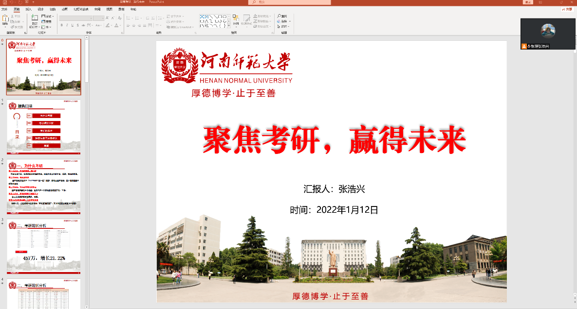 2022年1月12日,物理学院采取线上会议形式在腾讯会议上召开2019级全体学生考研通气会。2019级全体学生以及学生家长参加了本次会议。