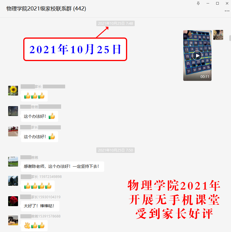 扎实开展“无手机课堂”。物理学院自2019年起,在个别班级试点无手机课堂,2021年起实现所有专业课堂无手机课堂制度,效果良好,2021级物理学专业挂科率下降近三十个百分点。本学期,学院持续开展“无手机课堂”活动,培养物理学院学生形成“两不一自觉”习惯,提升课堂教学效果,降低“低头率”,提升“抬头率”。辅导员通过“会师星期一”先后为各班召开“无手机课堂”主题班会,呼吁学生做到上课不带手机、不玩手机、自觉存放。学院党委副书记和各年级辅导员定时和不定时检查各个班级无手机课堂落实情况和学生上课情况。