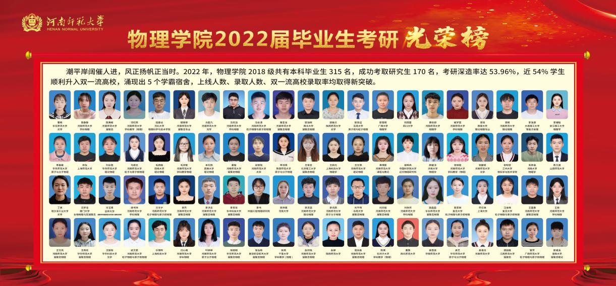 潮平岸阔催人进,风正扬帆正当时。2022年,物理学院2018级共有本科毕业生315名,成功考取研究生170名,考研深造率达53.96%,近54%学生顺利升入双一流高校,涌现出5个学霸宿舍,上线人数、录取人数、双一流高校录取率均取得新突破。