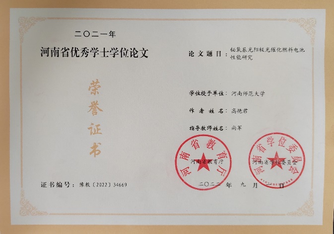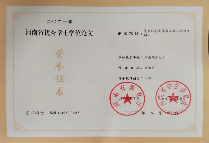 近日,河南省学位委员会办公室公布了2021年河南省优秀学位论文评选结果,我院物理学专业高艳君同学(指导老师:尚军)、光电信息科学与工程专业高怡雯同学(指导老师:于坤)的本科毕业论文获得2021年河南省优秀学士学位论文,两位老师获得2021年度河南省优秀学位论文指导老师。