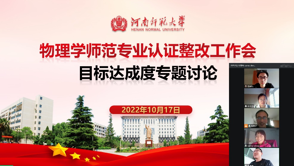2022年10月17日,物理学院通过腾讯会议召开物理学师范专业认证整改工作会,对课程目标设置及毕业目标达成度计算、支撑等问题进行专题讨论。物理系马淑红教授、杨炳方教授、段晓东博士、王艺龙博士及学科教学研究所陈留定博士参加了本次专题讨论,讨论会由杨炳方教授主持。