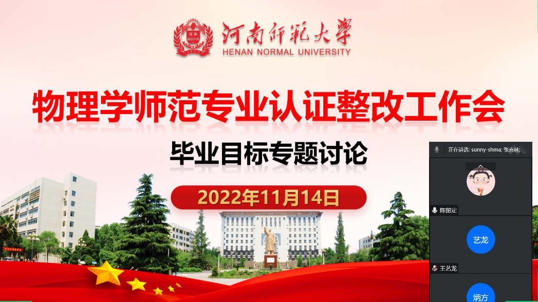 2022年11月14日,物理学院通过腾讯会议召开了物理学师范专业认证整改工作会,对修订培养方案中毕业目标相关问题进行了专题讨论。物理系马淑红教授、杨炳方教授、张喜林、段晓东、王艺龙、孟举、普洁及学科教学研究所陈留定老师参加了本次专题讨论,讨论会由杨炳方教授主持。