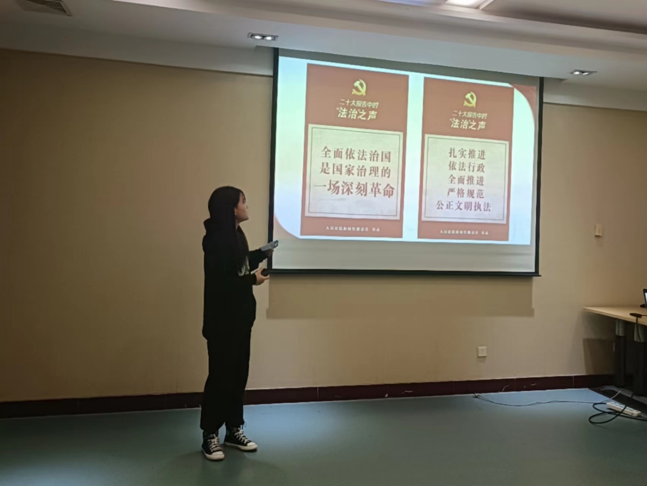 选手们从提供的案例中选取有较大影响力的进行演讲,他们从案例出发,凭借出色的演讲技巧,以铿锵有力的语言,朴实真挚的情感,分析案例体现的法治精神和示范意义。在五分钟左右的演讲中,选手们紧扣主题,立足实际,以二十大思想为引领,以法治为出发点,结合PPT生动地诠释自己对于案例的看法和法治意识的重要性,尽显物院学子朝气蓬勃、积极向上的青春风采。