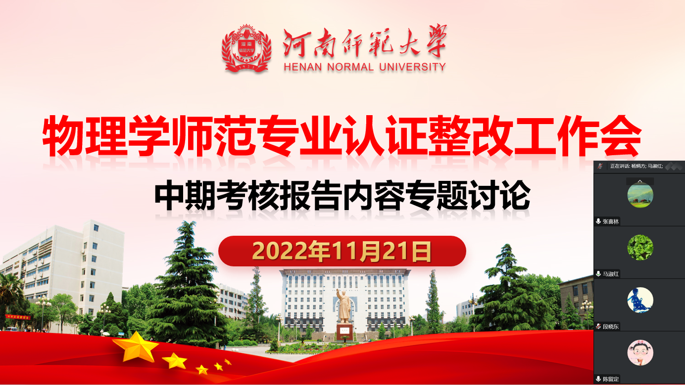 2022年11月21日,物理学院通过腾讯会议召开了物理学师范专业认证整改工作会,对师范专业认证中期考核报告内容进行了专题讨论。物理系马淑红教授、杨炳方教授、张喜林、段晓东、王艺龙、孟举、普洁及学科教学研究所陈留定老师参加了本次专题讨论,讨论会由杨炳方教授主持。