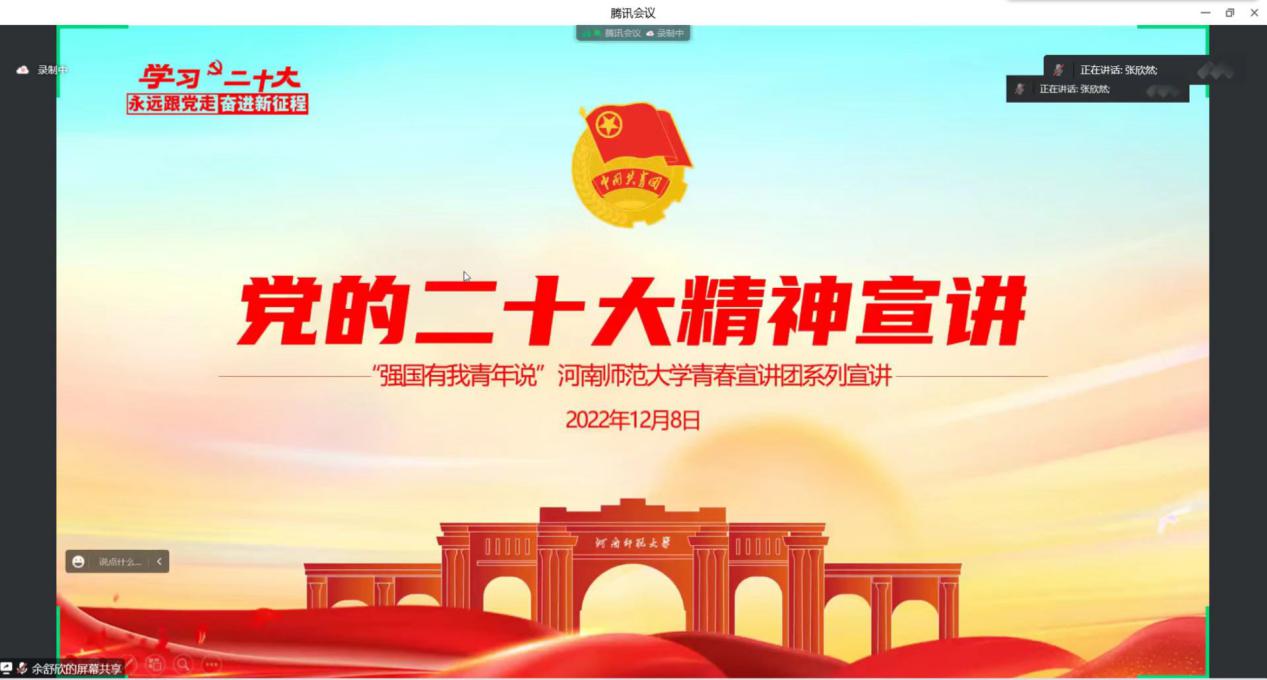 为深入学习贯彻党的二十大精神,锤炼学生政治品格,加强学生党性修养,切实引导青年把思想和行动统一到党的二十大精神上来,12月8日中午,物理学院开展线上“强国有我青年说”党的二十大精神主题宣讲活动。物理学院青马班全体学员、团委和各年级团学骨干170余人参加活动。