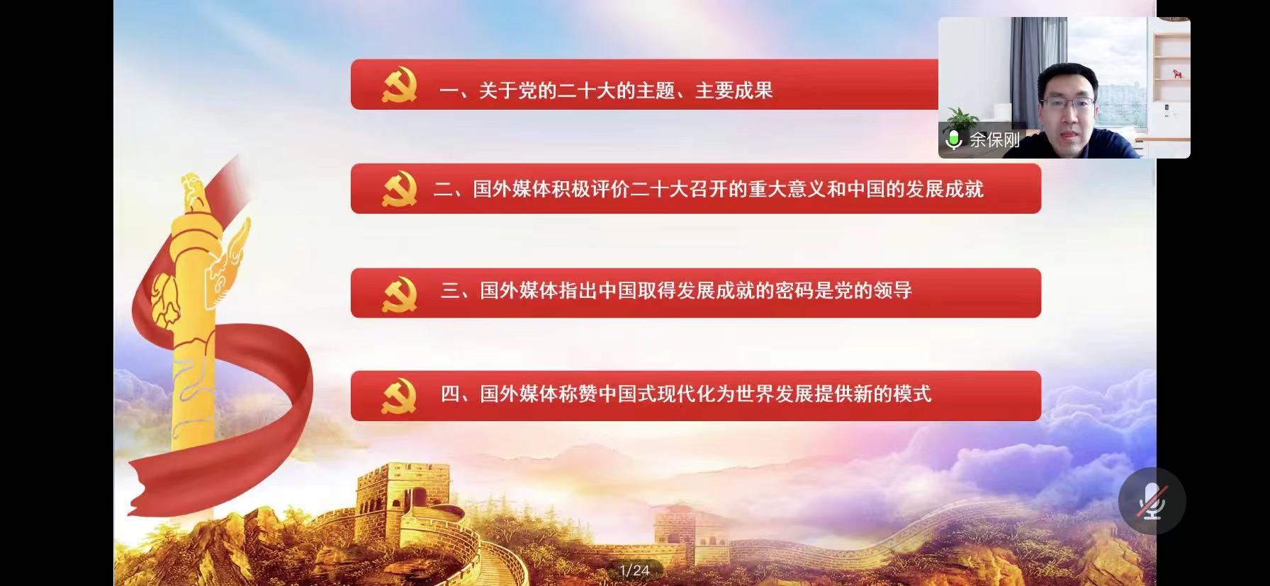 为深入学习宣传贯彻党的二十大精神,引领广大师生全面准确领会党的二十大精神,12月16日上午,党的二十大精神校内宣讲团成员、马克思主义学院副院长余保刚教授应邀为物理学院、历史文化学院党员师生作了《国外媒体中的二十大报告》为题的线上报告。报告会由历史文化学院党委书记李峰主持。