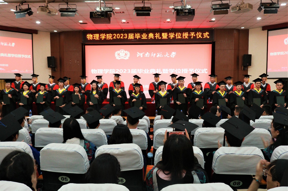 芳华六月,骊歌渐响。6月5日,物理学院在物理北楼三楼报告厅举行2023届毕业典礼暨学位授予仪式。校党委常委、副校长刘玉芳,学院党政领导、导师代表、教师代表、学生家长代表,2022届毕业生代表及2023届全体毕业生参加了典礼。仪式由学院党委副书记宋艳兵主持。