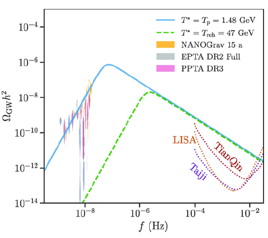 在这篇发表的文章中,下面的图形清晰展示了理论预测的结果。其中蓝色实线代表了过冷相变所产生的引力波谱,而当考虑相变释放能量可能引起的重加热效应时,引力波谱将向右下方移动,如绿色虚线所示。根据这个图形的结果,我们可以期待使用现有的引力波探测设施(如中国的天眼和欧美的脉冲星测时阵列)来验证这些低频引力波的存在。同时,高频部分的引力波则有望在未来的引力波探测项目(比如中国的天琴和太极项目以及欧洲的LISA项目)中得到探测。