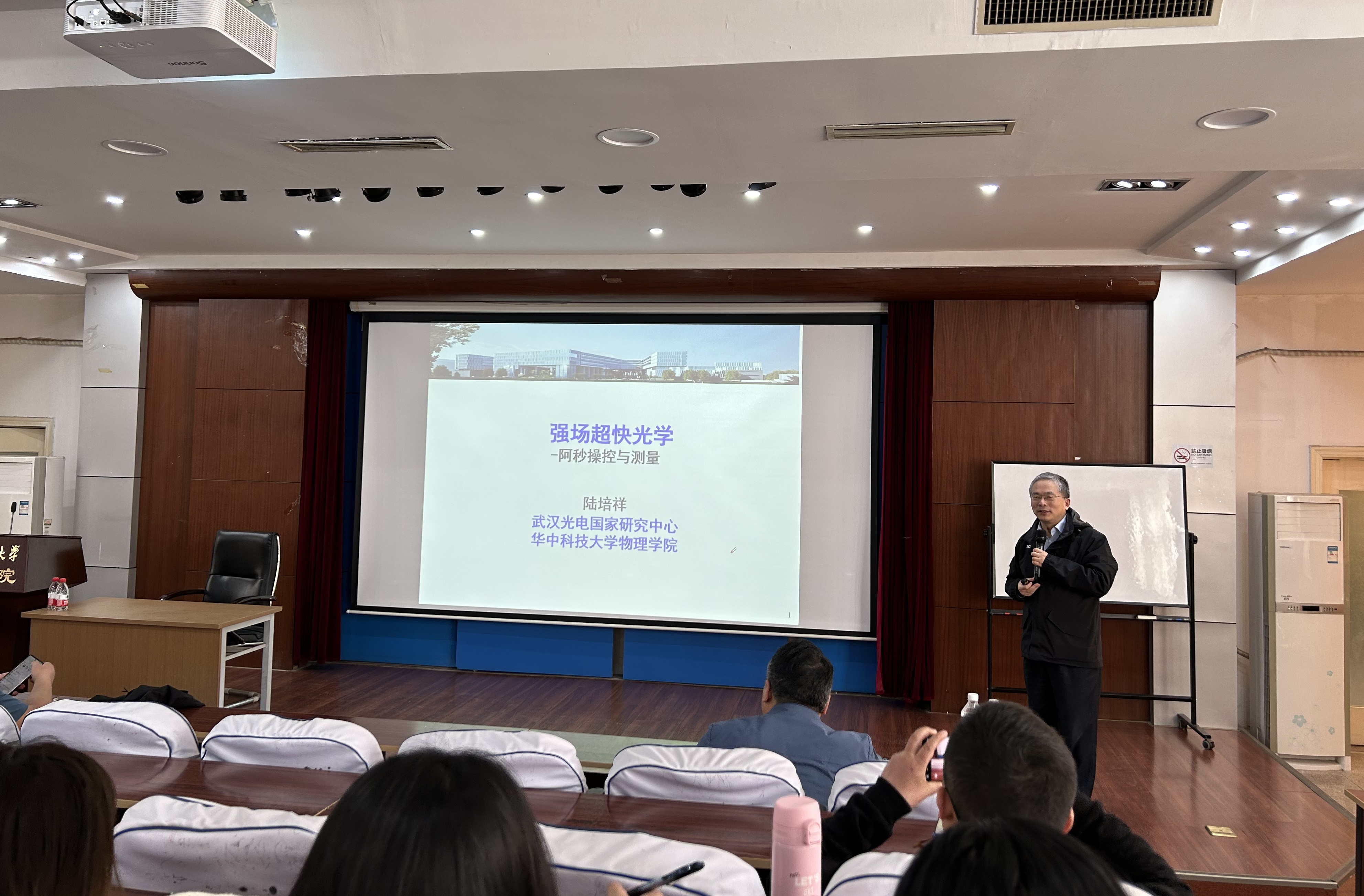 3月30日下午,应我校邀请,华中科技大学陆培祥教授来我校访问,在物理南楼二楼报告厅与物理学院的师生进行了一场亲切友好的座谈和交流,陆培祥教授呈现了一场精彩的报告,报告题目是“强场超快光学—阿秒操纵与测量”,物理学院副院长于坤教授主持,副院长秦朝朝教授参加了报告会。