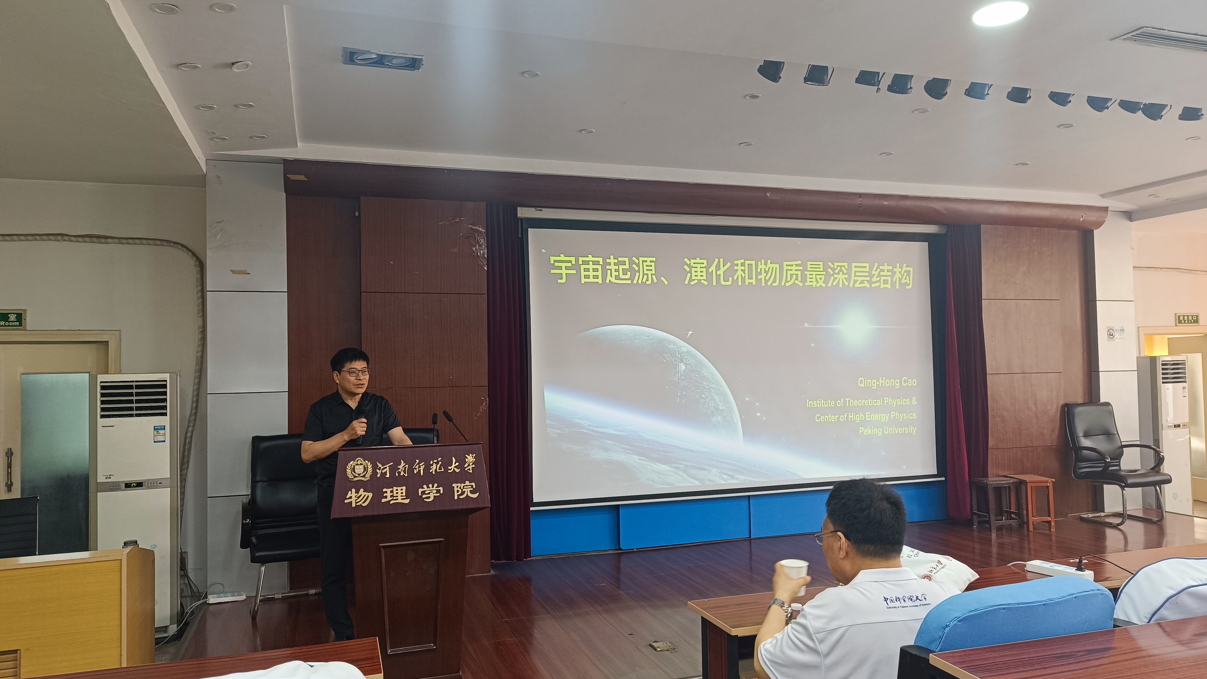 5月13日下午,应我校物理学院邀请,北京大学物理学院副院长曹庆宏教授在物理南楼二楼报告厅为物理学院的师生作了题为“宇宙起源和物质最深处”的学术报告,会议由杨金民教授主持。