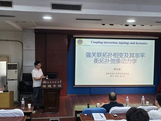 6月1日上午,国防科技大学李永强教授应邀为物理学院师生作了题为“强关联拓扑相变及其非平衡拓扑弛豫动力学”的学术报告,学院相关专业教师、研究生和本科生参加了此次报告。