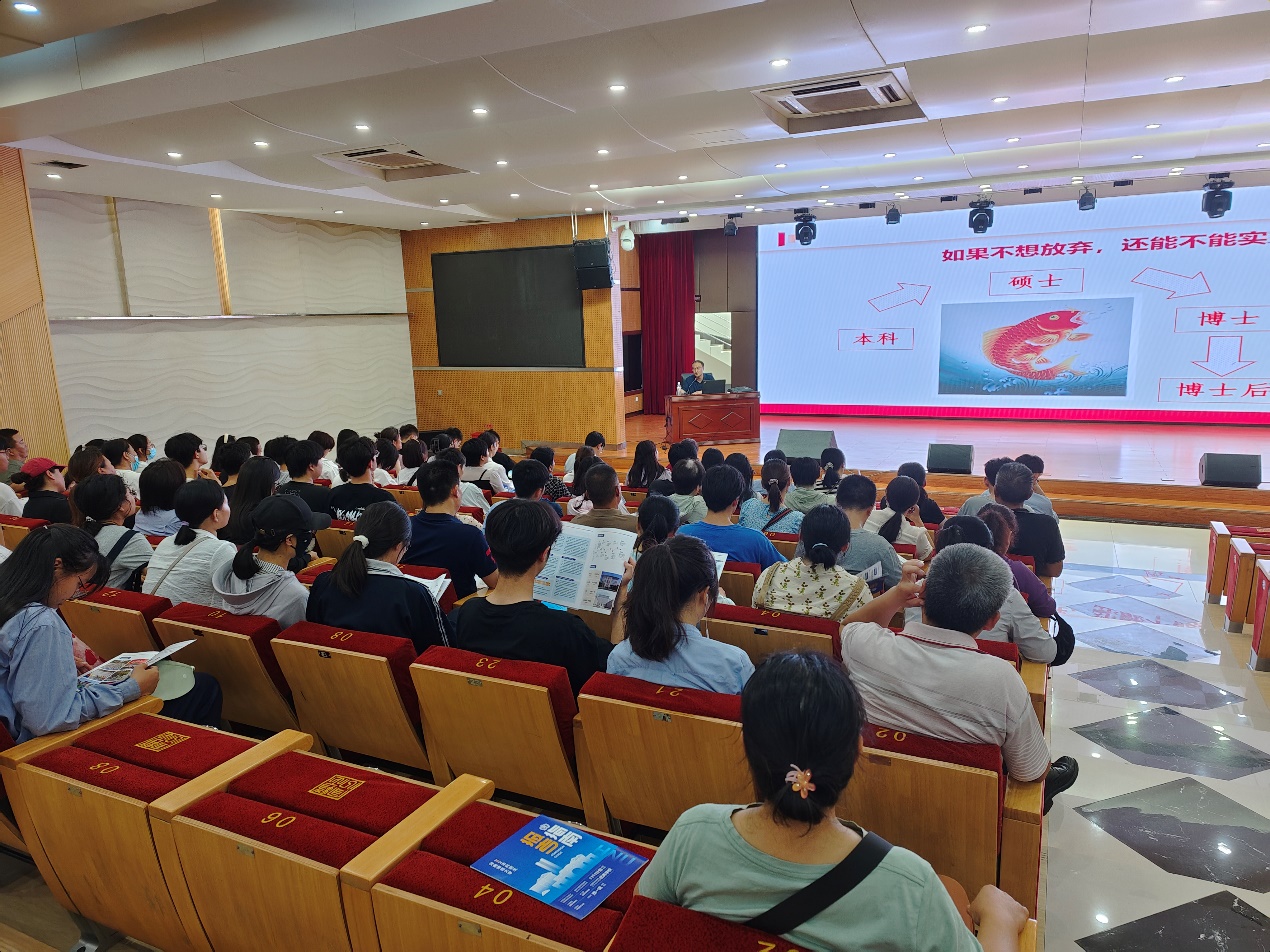 物理学院宣讲团成员杨炳方教授向考生及家长作宣讲报告。杨炳方教授向与会人员详细介绍了2024年最新的高招政策及高考志愿填报技巧和注意事项,着重介绍了我校的总体情况、特色亮点、专业设置、生活设施及最新招生信息。