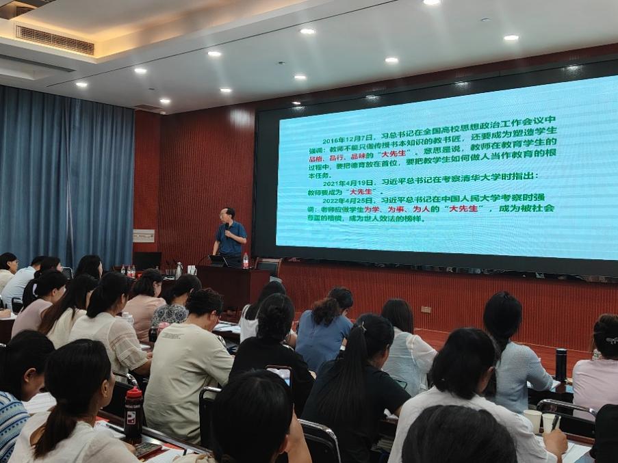 开班仪式结束后,河南师大附中国家“万人计划”教学名师获得者刘新选作了题为《新时代大先生》的报告,结合习近平总书记关于教育的重要论述,阐释了“大先生”“教育”“教师”的深刻内涵,强调了师德的重要性,并详细讲解高尚师德的养成路径。