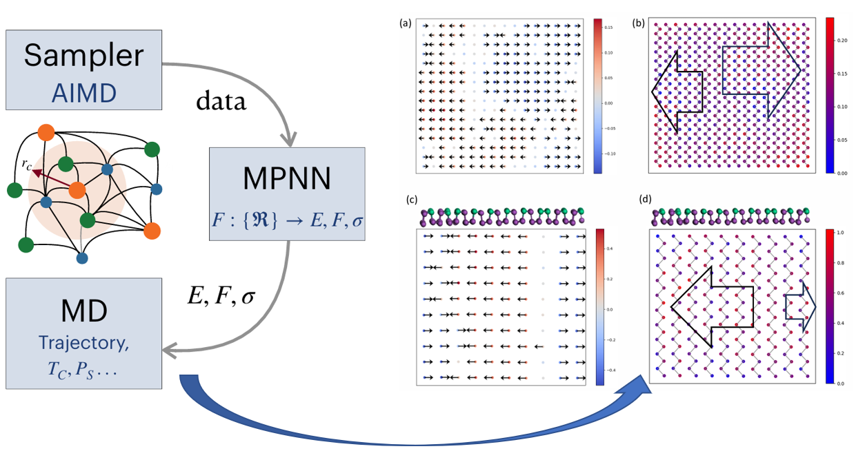 针对上述体系,张岩星及其合作者取得如下进展:一是采用消息传递神经网络对铋单层的势能面(PES)进行建模,并实现了小于1.2 meV/原子的误差。二是借助机器学习模型的高准确性和快速预测能力,开展了深入且大规模的原子模拟。这些探索旨在理解温度依赖的相变,特别是自由悬浮单层与受基底约束的单层之间的区别。三是通过在模拟中使用的大型系统,还能观察到这些系统内的铁电畴,并揭示其固有的晶格热导率。