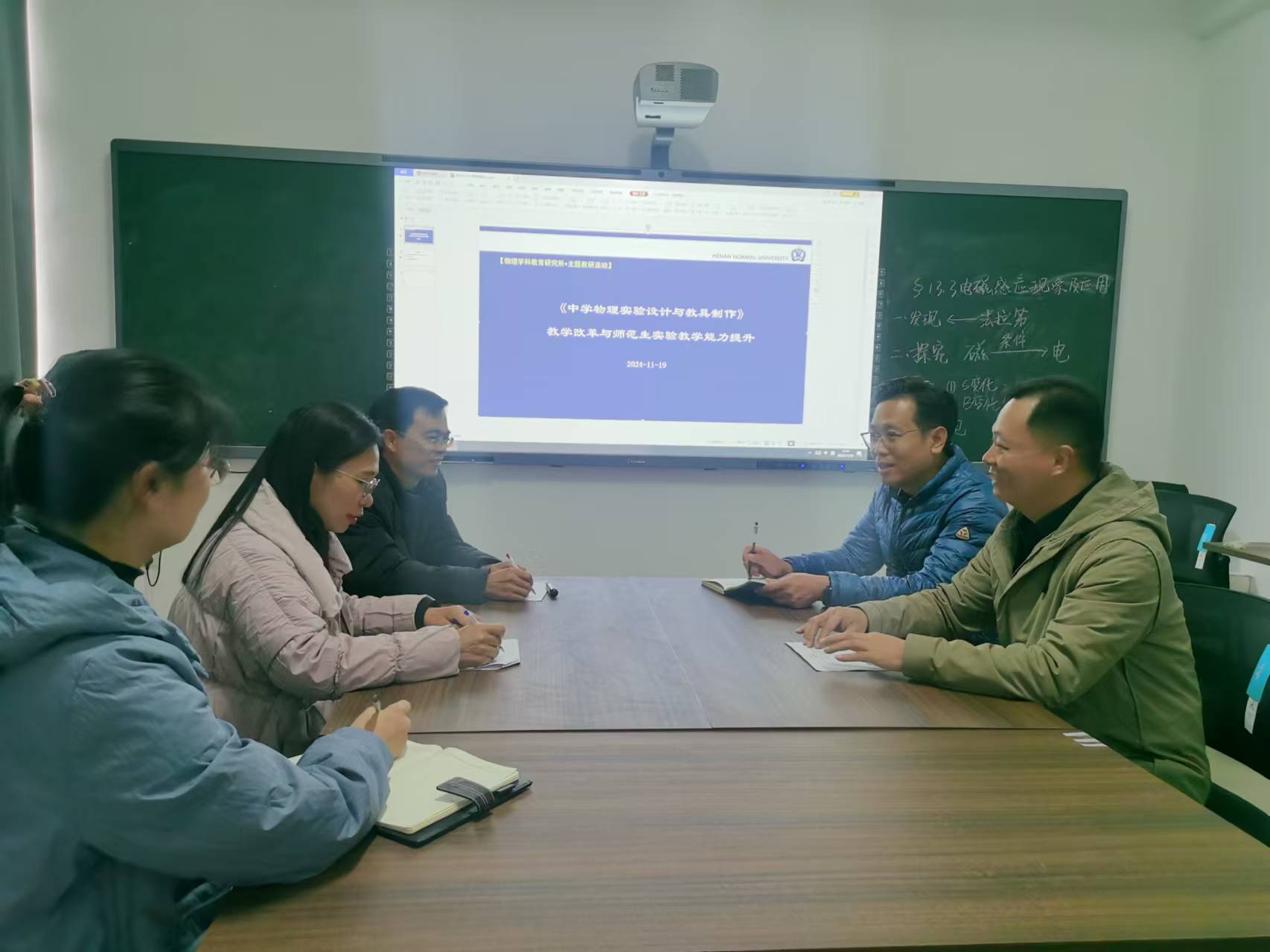 2024年11月19日下午,物理学科教育研究所在物理北楼A309房间组织开展了本学期的第一次主题教研活动。本次教研活动的主题是“《中学物理实验设计与教具制作》教学改革与师范生实验教学能力提升”,《中学物理实验设计与教具制作》课程全体教师参加了研讨。