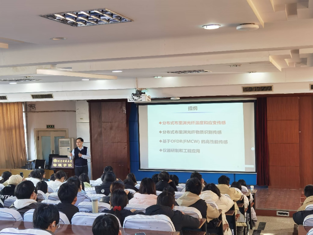 1月7号上午,哈尔滨工业大学航天学院副院长、长江学者特聘教授董永康教授应邀为物理学院师生作了题为‘‘高性能分布式光纤传感及其应用’’的学术报告。物理学院相关专业教师和研究生参加了此次报告。