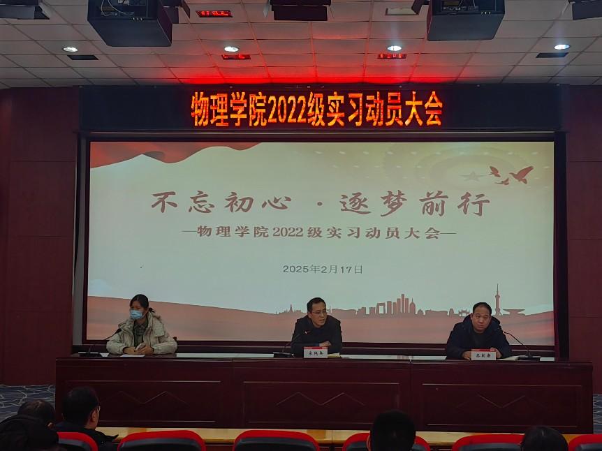为向学生传达最新的实习实践安排,确保实习工作的有效开展, 2月17日,我院于物理北楼报告厅隆重召开2022级实习动员大会。学院党委副书记宋艳兵、副院长秦朝朝出席会议,2022级辅导员、实习带队老师、班主任和全体2022级本科生参加。