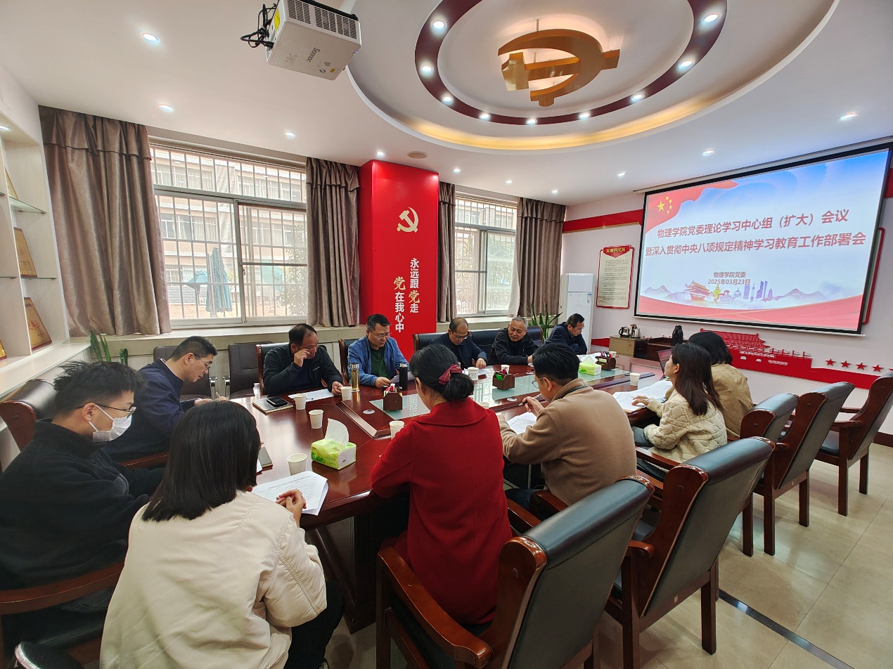 3月23日上午,我院在物理北楼党建会议室召开党委理论学习中心组(扩大)会议暨深入贯彻中央八项规定精神学习教育工作部署会。学院全体党政领导班子、党委委员和党支部书记代表参加了会议。会议由院党委书记陈明银主持。