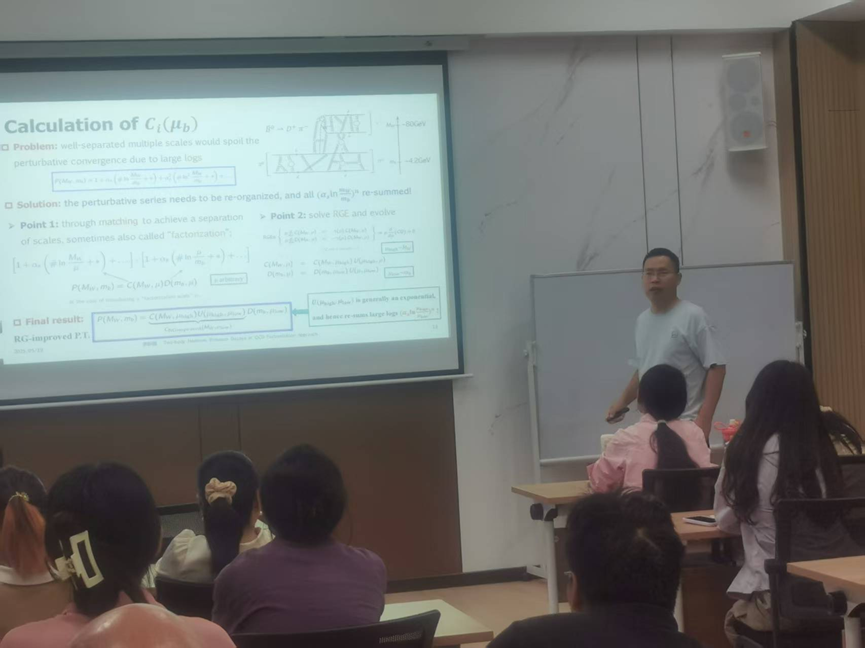 李老师在报告中介绍了B介子非轻衰变对于检验粒子物理标准模型中夸克混合矩阵描述的CP破坏图像的重要意义,以及B介子实验和理论所取得的进展。重点介绍了如何基于QCDF/SCET理论对强子矩阵元进行精确计算,课题组在NLO基础上进行NNLO计算的动机和取得的成绩,以及如何由SCET得到QCDF,对实验结果进行了合理解释,目前理论计算仍然面临的挑战等。李老师的报告内容丰富,有助于师生了解在QCDF/SCET理论框架下B介子研究的最新研究进展。李老师还与现场的师生进行了互动,回答了师生提出的问题,师生们受益匪浅。