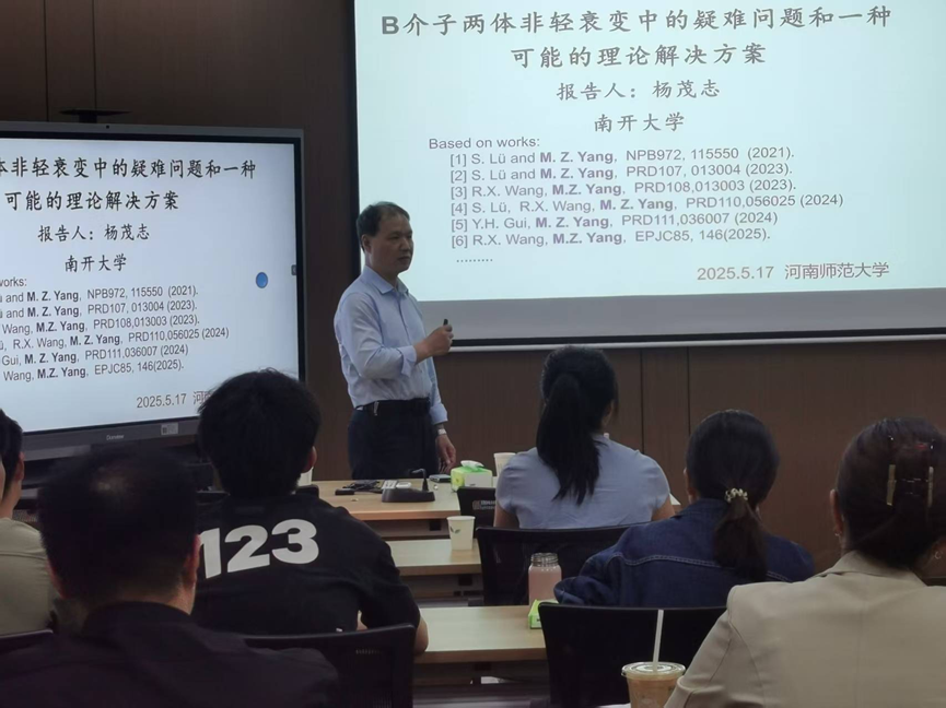 2025年5月17日,应物理学院邀请,南开大学杨茂志教授在物理北楼C505教室为学院50余名师生带来了一场精彩的讲座,报告题目是“B介子两体非轻衰变中的疑难问题和可能的理论解决方案”。