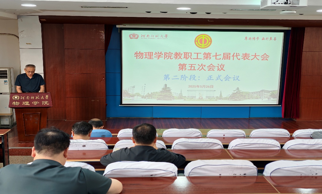 5月26日下午,物理学院教职工第七届代表大会第五次会议(含预备会议)在物理南楼二楼报告厅成功召开,物理学院全体领导班子、30名教职工代表参加了会议,会议由学院工会主席、副院长刘起胜主持。