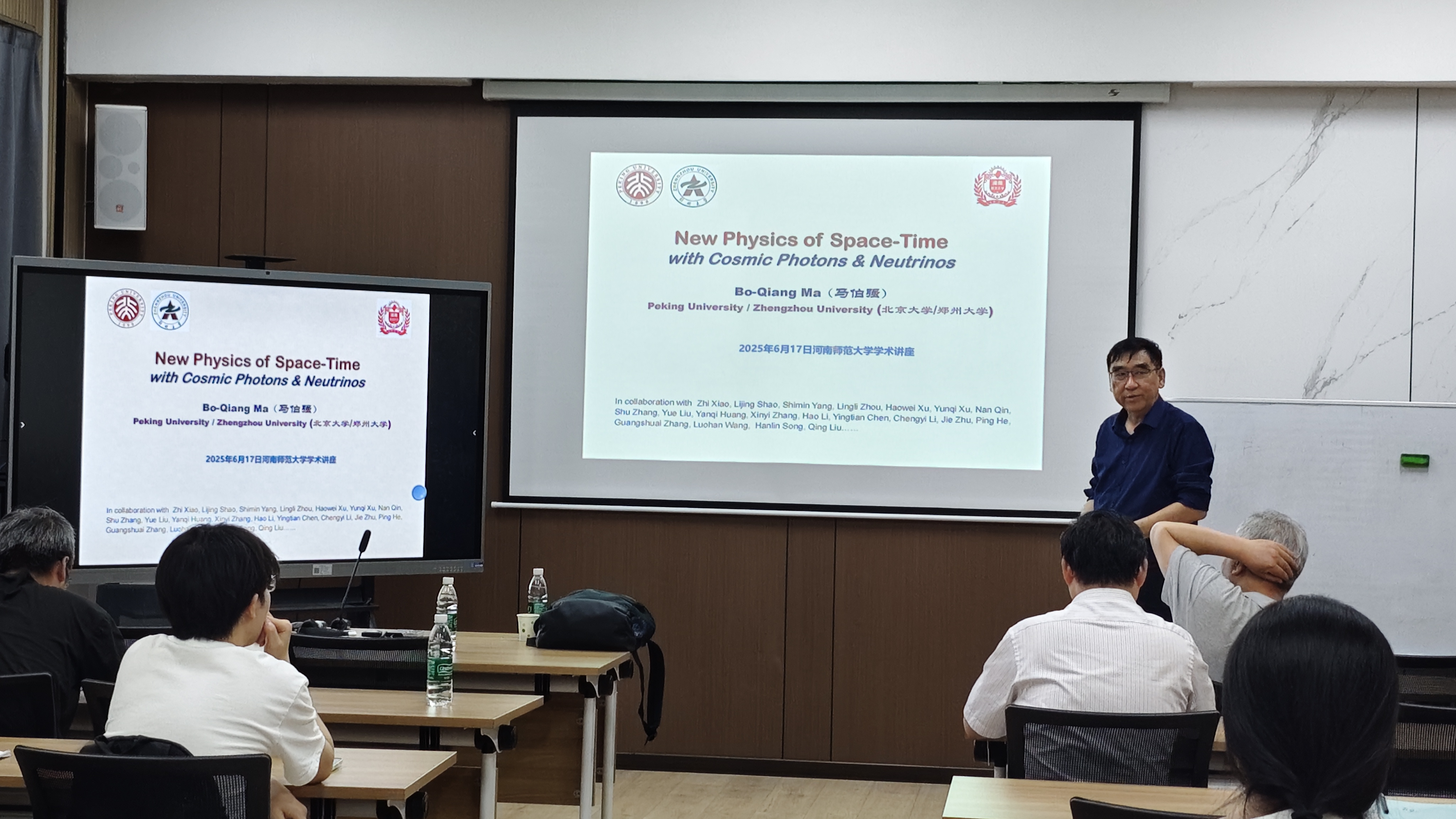 6月17日下午,应物理学院马建平教授所邀,郑州大学物理学院特聘教授马伯强在物理北楼C505作了题为“高能宇宙粒子与时空对称性”的学术报告,物理学院的相关老师和研究生聆听了此次报告,报告会由马建平教授主持。