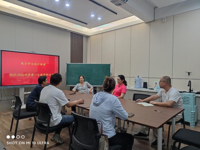 2025年9月4日,《热力学与统计物理》教学团队,在物理南楼115会议室举行了本学期第一次教学研讨会,参会教师有楚兴丽、张娜、杨春洁、李惠静、耿振铎、张达崴及陈响共7人。会议由课程负责人楚兴丽老师主持,参会教师主要围绕三个议题进行了热烈的讨论和交流。