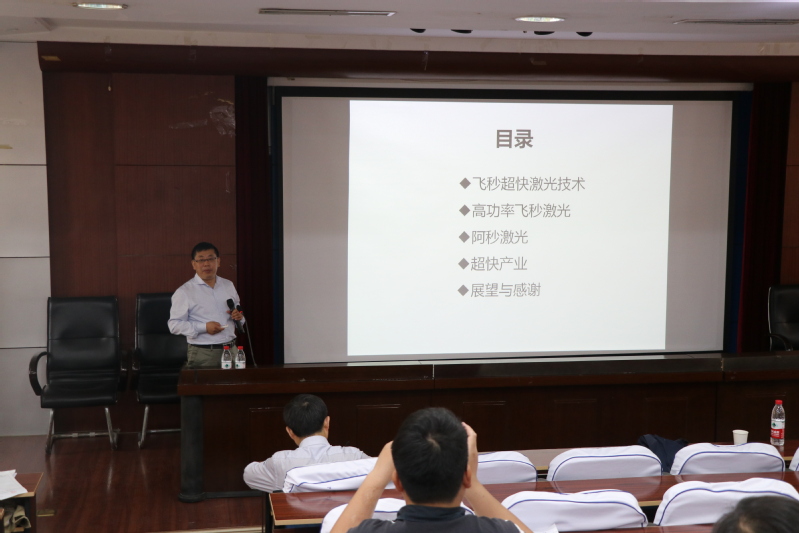 魏志义研究员以“超快激光——从飞秒技术到阿秒科学”为题,首先向师生介绍了近几十年来超快超强激光的发展在多个领域的突破,然后阐述了飞秒激光的特点以及近些年国际上和其团队对于飞秒激光器的研究;最后介绍了超快激光的更新到阿秒激光的重要进展及应用前景。