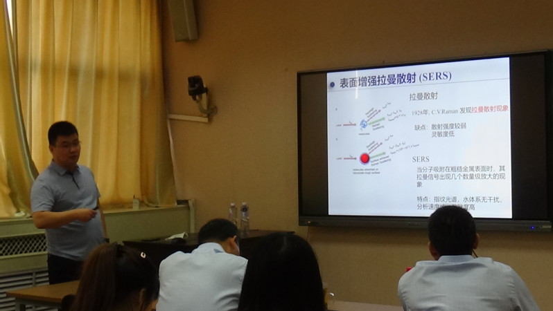 宋朋教授以“SERS光谱技术在分析检测和催化领域中的应用”为题,首先向师生介绍了表面增强拉曼散射(SERS和传统的拉曼散射的不同,然后介绍了SERS在分析检测和分子催化方面的应用。最后宋朋教授提出了对于有关于SERS活性基低的开发,建立SERS光谱数据库和拓展SERS分子催化体系类型的工作展望。