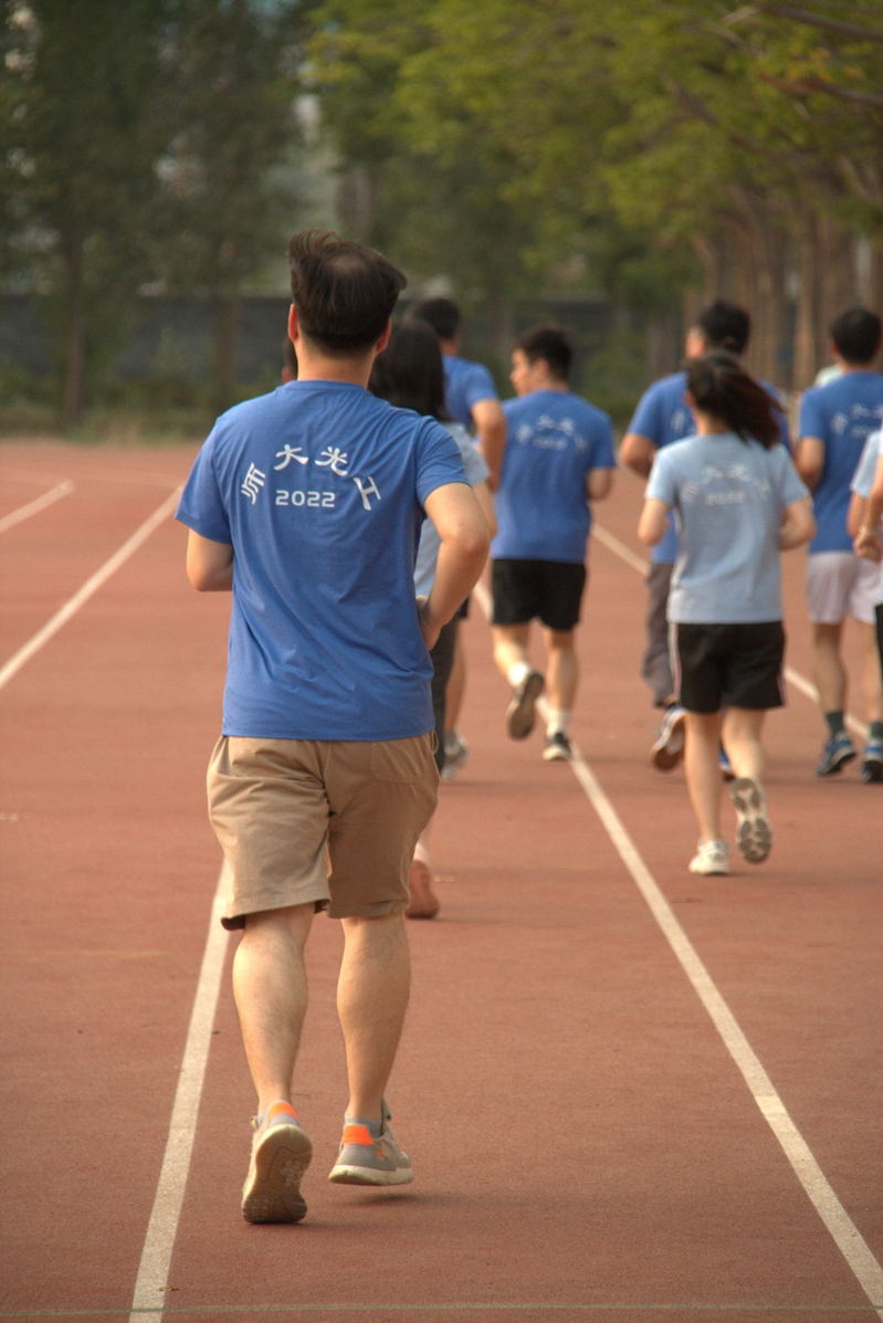 在起跑点,全体参赛师生身穿印有“2022师大光工”标语的毕业纪念T恤,满怀着对母校的眷恋和对未来的憧憬蓄势待发。随着发令枪响,全体参赛师生沿着跑道奋力奔跑,在“毕业长跑”中进一步厚植师大‘厚德博学,止于至善’的校风校训,坚定“永远跟党走青春献祖国”的理想信念,为踏上人生新征程做好准备。