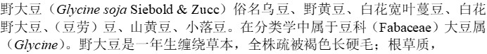 侧根密生于主根上部;茎纤细;叶顶生小叶卵圆形;总状花序,苞片披针形,花萼钟状;荚果长圆形,稍弯两侧扁,干后易裂;种子椭圆形,褐色或黑色。花期7-8月,果期8-10月。野大豆具有耐盐碱、抗寒、抗病等优良性状,在农业育种上可培育优良的大豆品种;全株为家畜喜食的饲料,可栽作牧草、绿肥和水土保持植物,茎皮纤维可织麻袋,种子含蛋白质30-45%,油脂18-22%,供食用、制酱、酱油和豆腐等,又可榨油,豆粕是优良饲料和肥料;全草可药用,有补气血、强壮、利尿等功效。野大豆是国家二级保护植物。