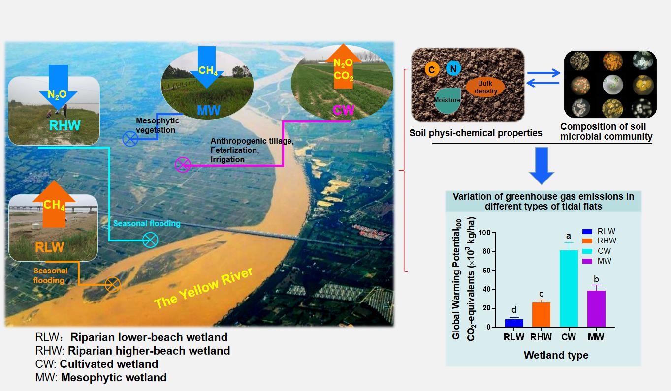 垦殖活动显著促进CO2N2O的累积排放量,分别是天然湿地的2.10-10.71倍和3.19-8.61倍。100年全球变暖潜势CO2当量在CW最高(81.175 t/ha),分别是RLWRHWMW9.933.122.11倍。温室气体通量与细菌OTUs y=0.71x-319.4R2=0.304)和Shannon指数(y=228.62x-796.6R2= 0.336)呈显著线性正相关。土壤CN和水分含量是细菌群落变化的主要驱动因素,进而协同影响温室气体通量。保持黄河漫滩河滨湿地原有状态或恢复耕地为湿地将对减缓温室效应有益。(Lin et al., 2022. Science of the Total Environment.