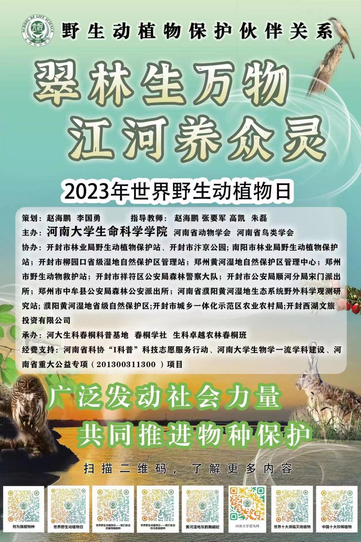 2023年世界野生动植物日,由伟德官网下载苹果版生命科学学院、河南省动物学会、河南省鸟类学会主办,开封市林业局野生动植物保护站、开封市汴京公园;南阳市林业局野生动植物保护站;开封市柳园口省级湿地自然保护区管理站;郑州黄河湿地自然保护区管理中心;郑州市野生动物救护站;开封市祥符区公安局森林警察大队;开封市公安局顺河分局宋门派出所;郑州市中牟县公安局森林公安派出所;河南省濮阳黄河湿地生态系统野外科学观测研究站;濮阳黄河湿地省级自然保护区;开封市城乡一体化示范区农业农村局;开封西湖文旅投资有限公司协办。在河大生科春桐科普基地举办了“翠林生万物,江河养众灵”系列科普活动,让学生们更加了解保护环境的重要性,唤醒大家对动植物环境保护的意识,为科学研究培养下一代接班人打下了良好的基础。