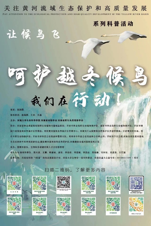近日,由河南大学生命科学学院、河南省动物学会、河南省野生鸟类观察学会主办,河南省林业调查规划院野生动植物与湿地监测站;开封市林业局野生动植物保护站、南阳市林业局野生动植物保护站;开封市柳园口省级湿地自然保护区管理站;郑州黄河湿地自然保护区管理中心;河南太行山国家级自然保护区济源管理局;开封黄河河务局;郑州市野生动物救护站;开封市祥符区公安局森林警察大队;郑州市中县公安局森林公安派出所;开封市汴京公园;河南省濮阳黄河湿地生态系统野外科学观测研究站;濮阳黄河湿地省级自然保护区;河南濮阳金堤河国家湿地公园协办。举办了以“让候鸟飞·呵护越冬候鸟,我们在行动”主题系列科普活动。在科普活动中同学们积极参与,踊跃发言,发表了自己的见解,为保护候鸟做出自己的一份贡献,为动物资源保护意识的发展产生了良好的基础。