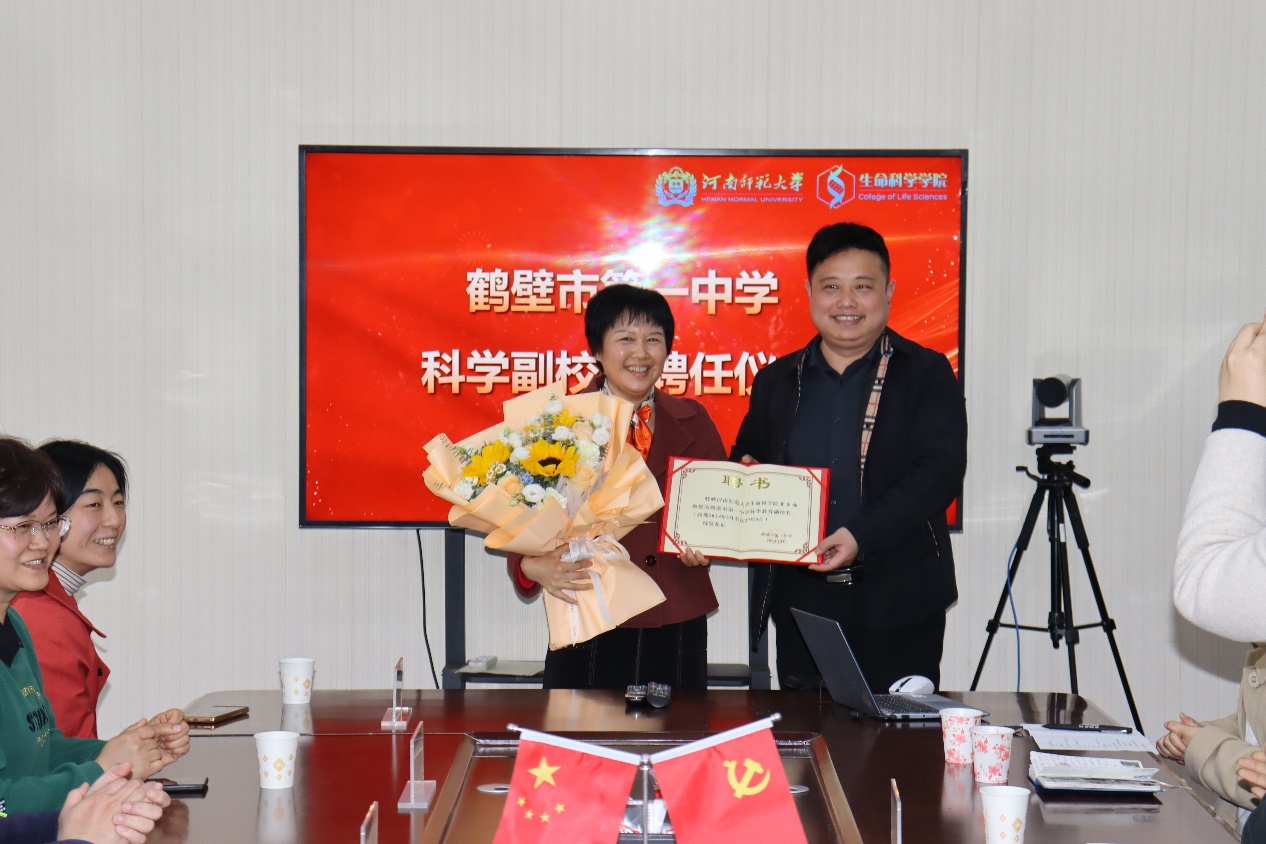 聂其帅为副站长董自梅教授颁发鹤壁市第一中学科学副校长聘书
