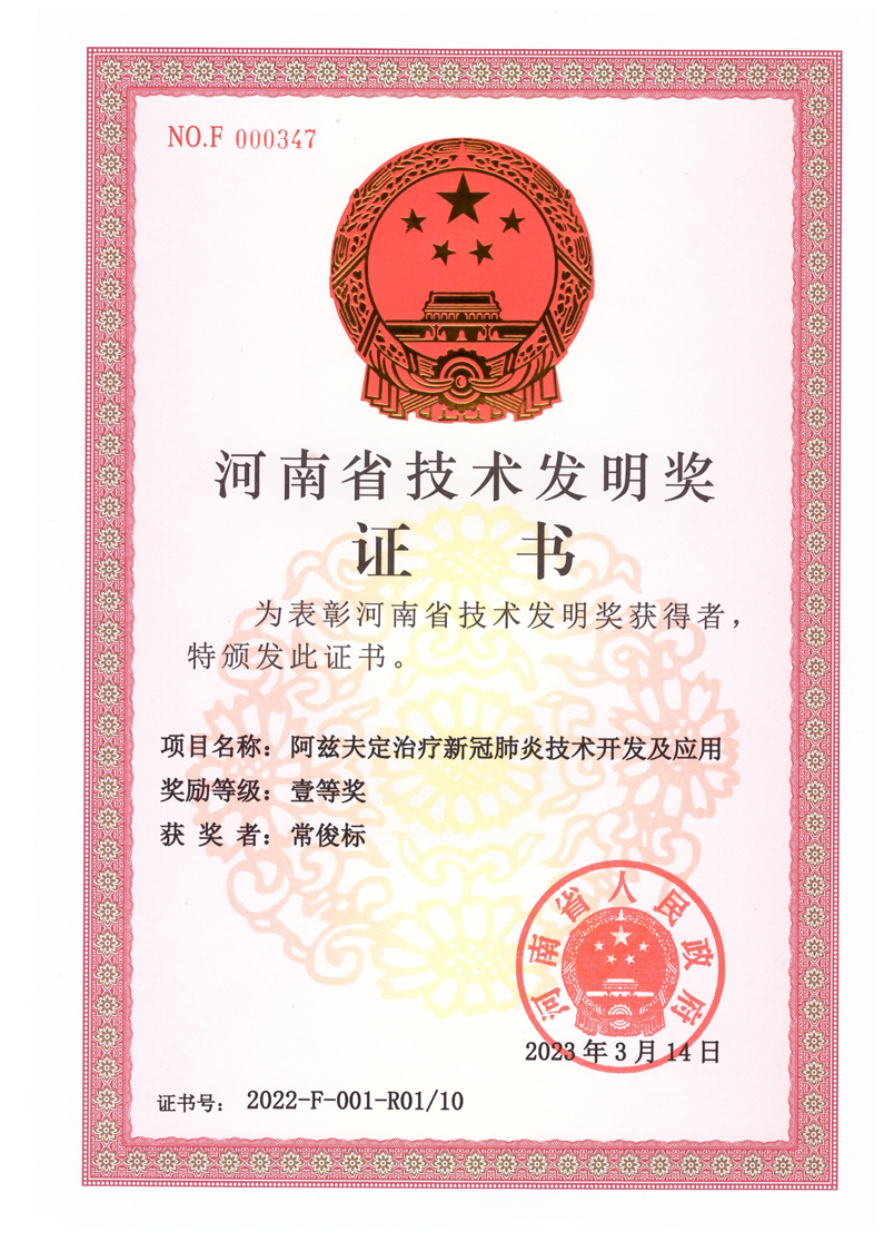 阿兹夫定荣获“河南省技术发明奖一等奖”