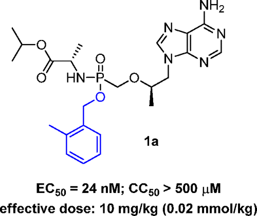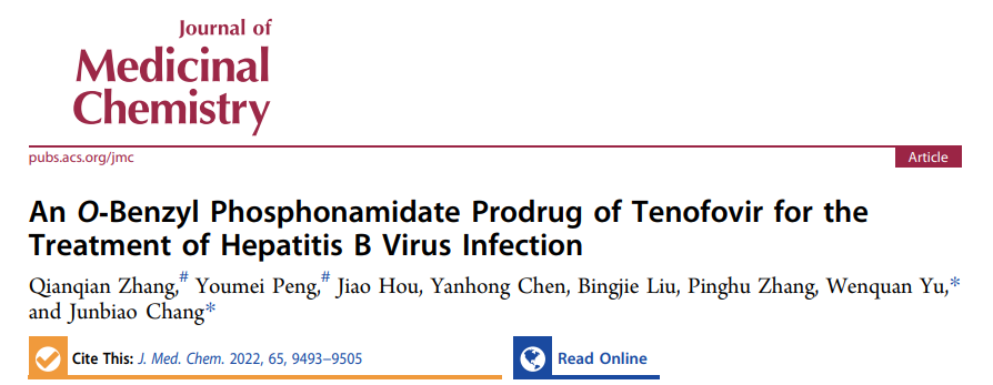 2022年7月,平原实验室主任常俊标教授团队在在 Journal of Medicinal Chemistry 杂志发表了题为“An O-Benzyl Phosphonamidate Prodrug of Tenofovir for the Treatment of Hepatitis B Virus Infection”的研究论文,设计并合成了一系列新的替诺福韦O-(取代苄基)磷酰胺前药,用于治疗乙型肝炎病毒(HBV)感染。对结构-活性关系的研究表明,带有邻甲基苄基的化合物(1a)具有最有效的体外抗HBV活性,耐受性良好,并且不会在动物肝脏中引起任何坏死、出血或炎症反应。进一步的研究表明,前药1a在治疗HBV感染的靶器官肝脏中的生物活性代谢产物(替诺福韦二磷酸,TFV-DP)暴露量高于等摩尔剂量的富马酸替诺福福韦阿拉芬酰胺(TAF)。
