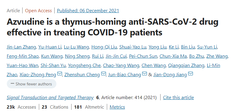 2021年12月6日,平原实验室主任常俊标教授及其合作团队在Signal Transduction and Targeted Therapy 在线发了表题为“Azvudine is a thymus-homing anti-SARS-CoV-2 drug effective in treating COVID-19 patients”的研究论文,该研究发现口服 Azvudine(FNC)可以在很大程度上以活性形式将药物集中在胸腺中,在体内有效抑制 SARS-CoV-2 复制,保护胸腺免疫功能,并快速治愈 COVID-19 患者。FNC 的发现对于应对 COVID-19 和冠状病毒流行非常重要。