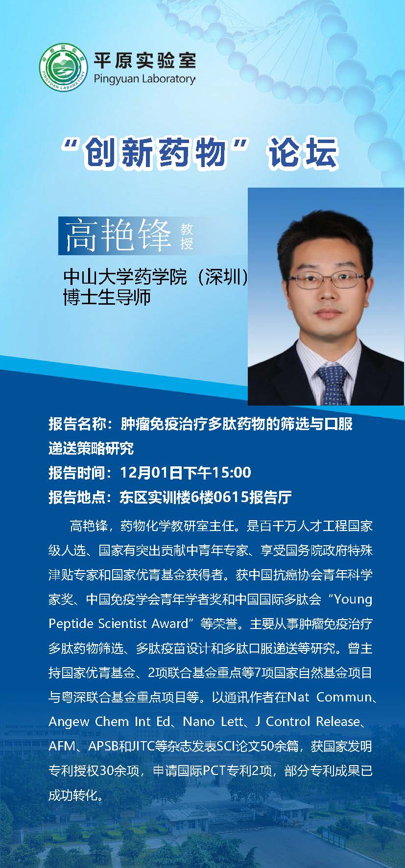 中山大学药学院高艳锋教授将应邀来我室讲学