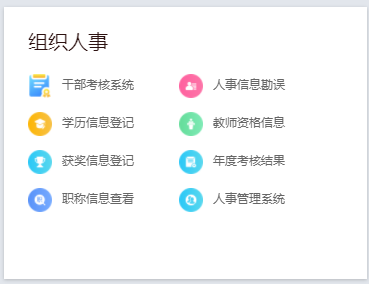 办事大厅--【组织人事】专栏提供人事相关的微服务菜单;其中【人事信息勘误】【学历信息登记】【教师资格信息】【获奖信息登记】4项为业务办理类,允许教职工自助核对修改信息,保存提交至人事处审核;【年度考核结果】【职称信息查看】2项为信息服务类,提供给教职工查看本人信息,如有错误,可致电人事处。