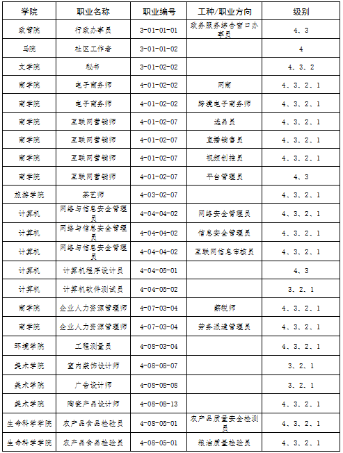 认定方式:此次职业技能等级认证以“课程融通”的过程化考核方式进行。各职业工种认证规则中选取的理论课程和实操课程的考核成绩均在60分(含60分)以上者为合格,每门考核成绩以学校教务系统录入记录的成绩为准,未录入学校教务系统的相关实验课程成绩以学院(部)盖章证明为准。