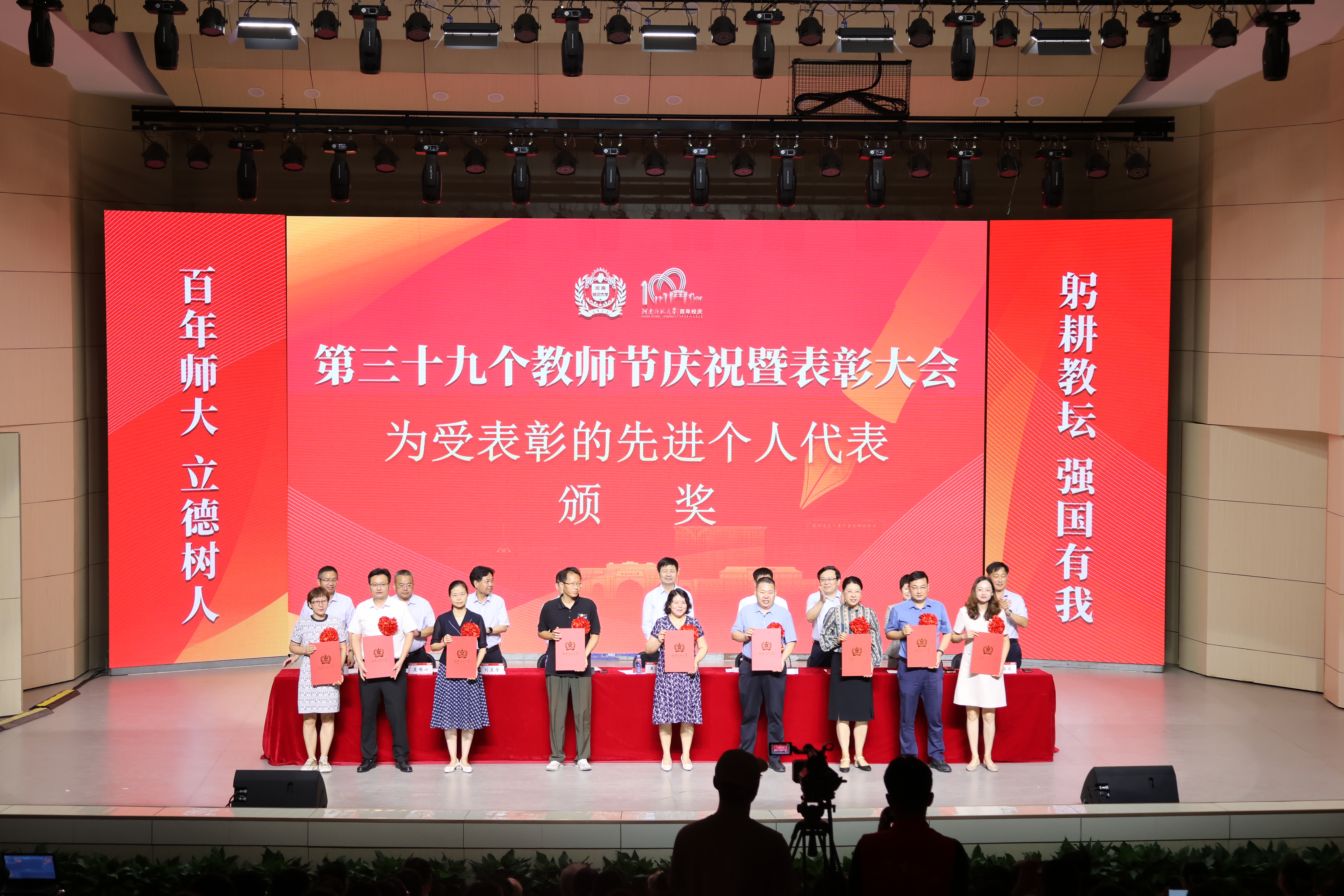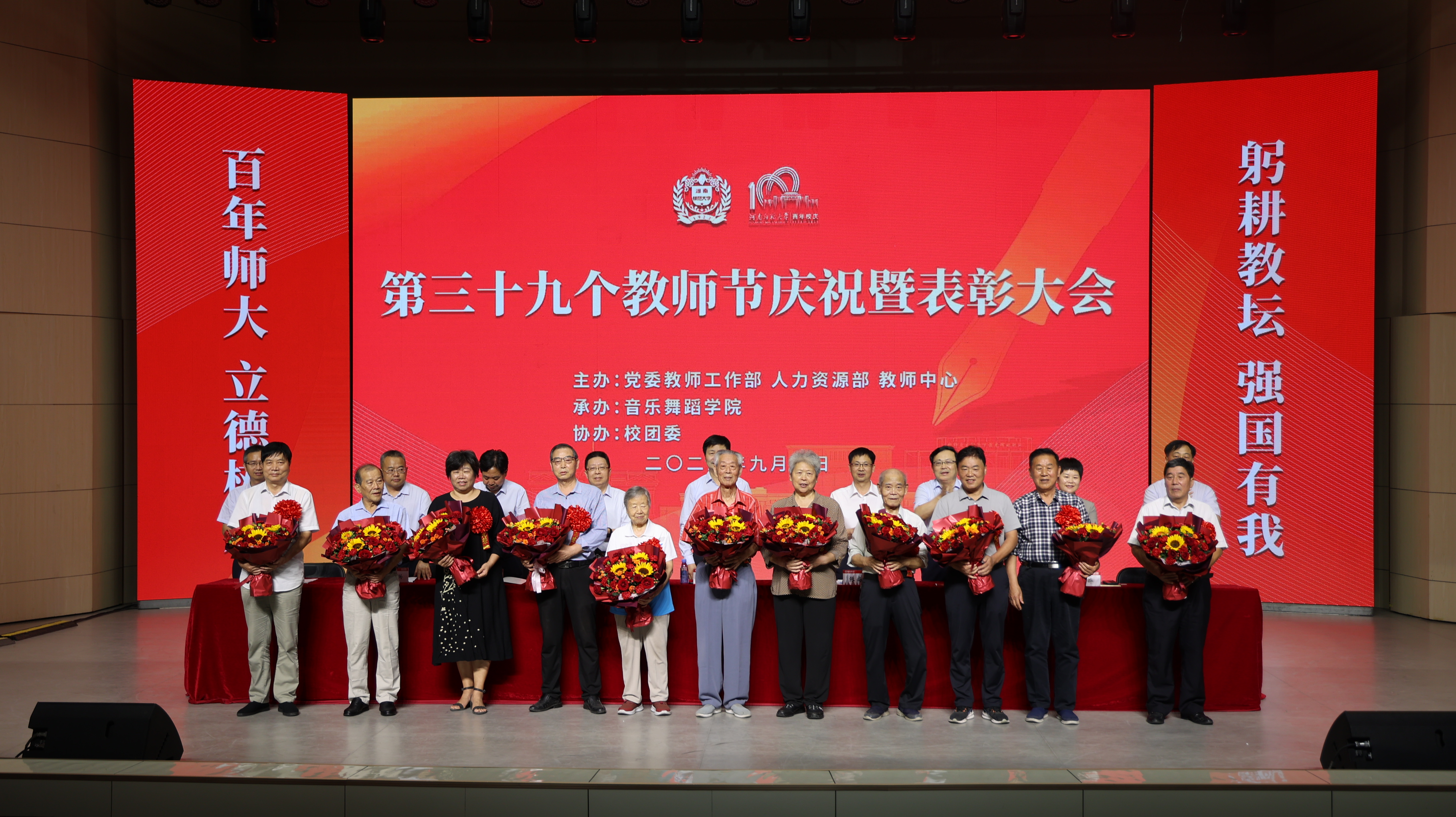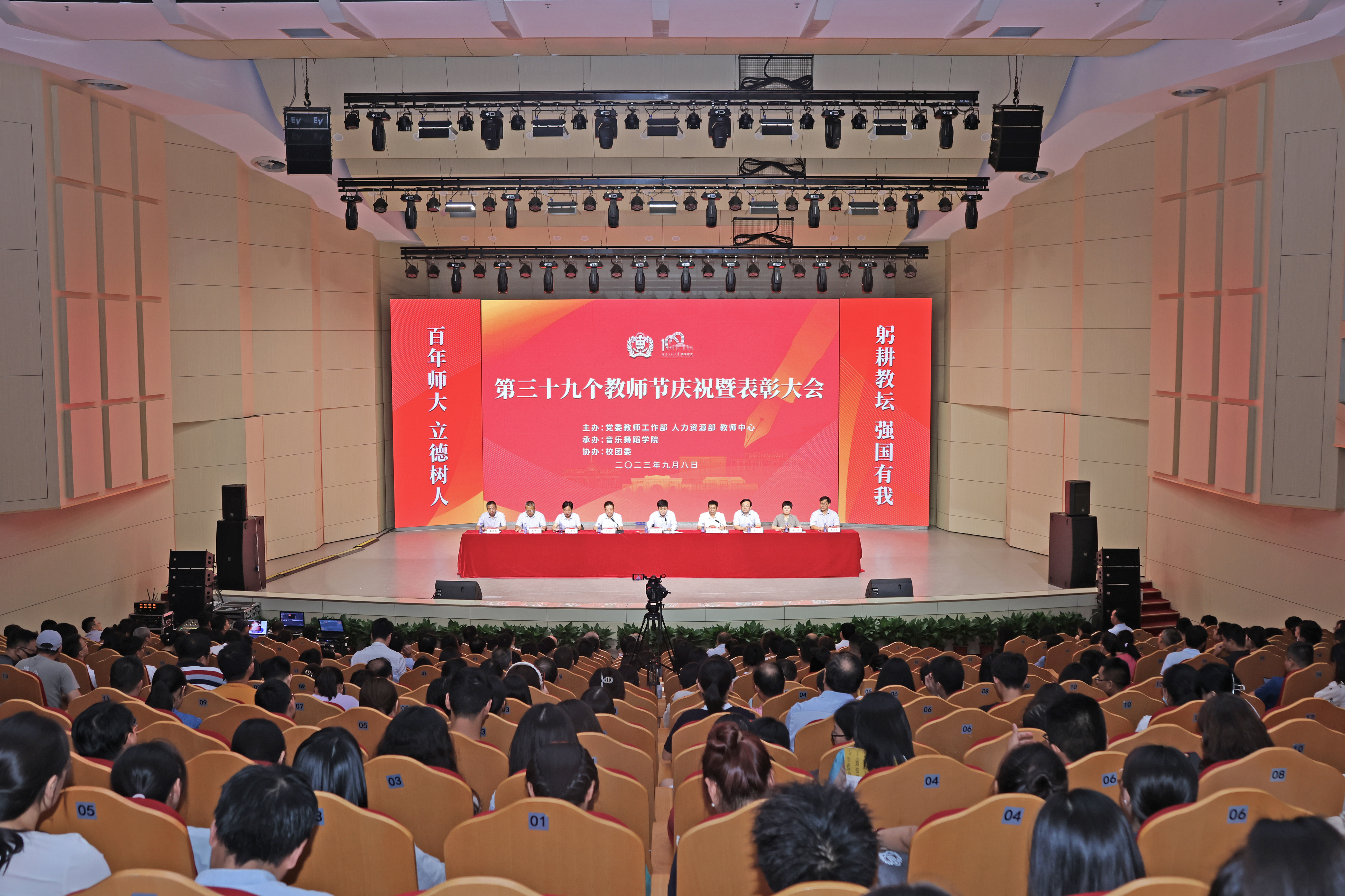 在百年校庆和第39个教师节来临之际,9月8日下午,我校在音乐厅隆重召开教师节庆祝暨表彰大会。校领导王宗敏、张尚字、马治军、李雪山、刘玉芳、宋晔、聂国兴、王玉良、秦法跃出席会议。学校离退休教师代表、各单位代表、在职教师代表、学生代表、受表彰教师代表近500人参加会议。会议由校党委副书记、工会主席马治军主持。