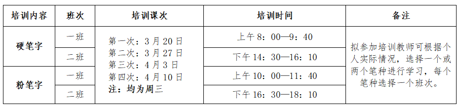 根据前期调研,本批次培训开设硬笔字和粉笔字,分别开设两个班,每个班均为四次课,培训班次、课次、时间等见下表,授课地点随后另行通知,拟参加人员可根据个人空余时间等实际情况进行报名。